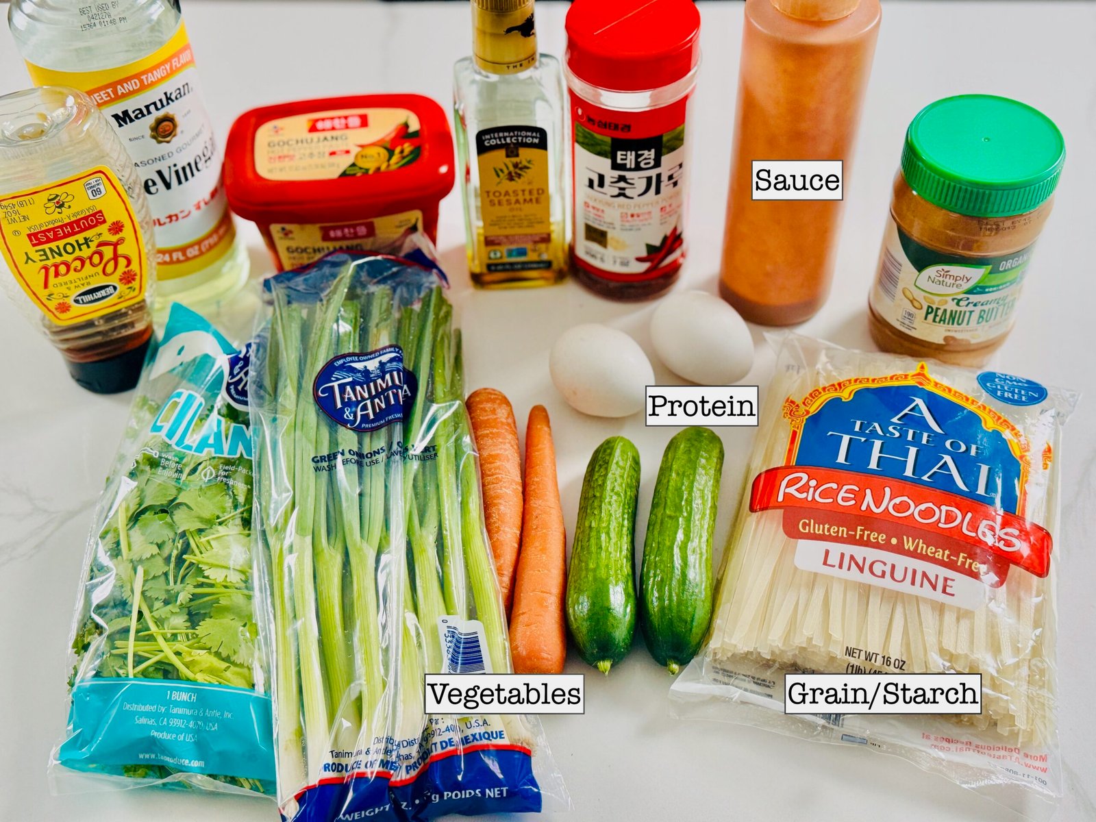 Rice noodles work beautifully here, but they are not required. You can use:
