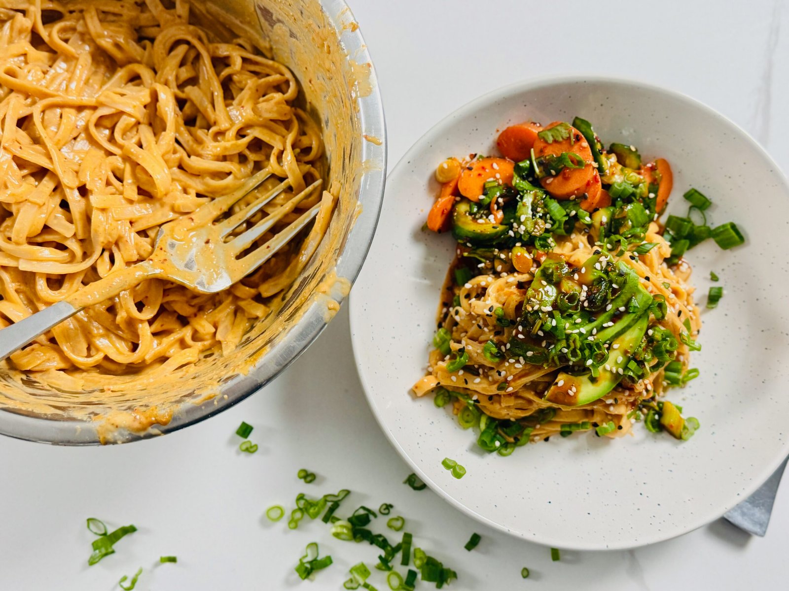 I started with the sauce. I already had my sesame ginger gochujang sauce made, and I noticed some noodles sitting nearby. From there, I just followed the formula I rely on over and over again: sauce, starch, vegetables, protein. I added a few vegetables, then realized I could turn that vegetable component into a proper side salad. That’s how the Smashed Cucumber Carrot Salad with Gochujang Chili Dressing ended up alongside the noodles.