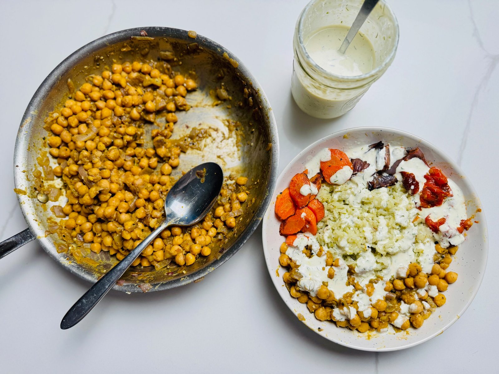 - Curry Chickpea bowl with roasted vegetables and a creamy sauce