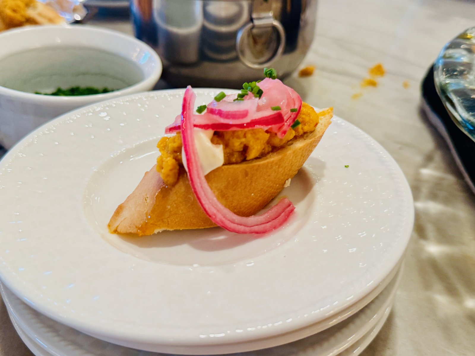 The original plan for the second course was confit egg yolk on toast with Parmesan, pickled red onion, and salt. I was excited about it. It felt elegant and restrained in the right kind of way.