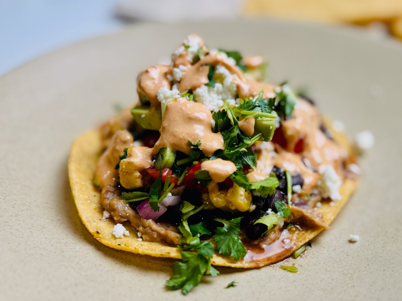 - Spread refried beans on tostada shells. Add black beans, corn, pico, avocado, queso fresco, cilantro, and finish with chipotle sauce.